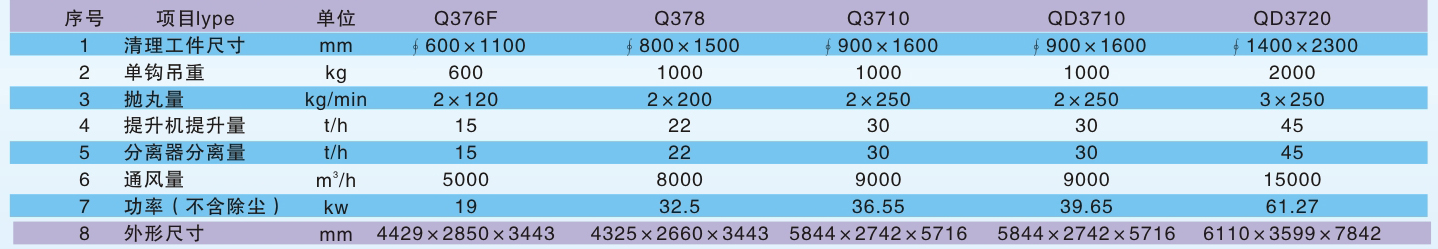 Q37 series hook type airless shotblast cleaning machine is mainly used forsurface cleaning and strengthening of steelstructural parts, castings,aluminum alloyparts and other spare parts,It is widely usedin foundry,forging,mechanical and steelindustry.In particular,Q378cleaner featuresno pit,double hook without rail exchanging,compact structure,and high productivity.